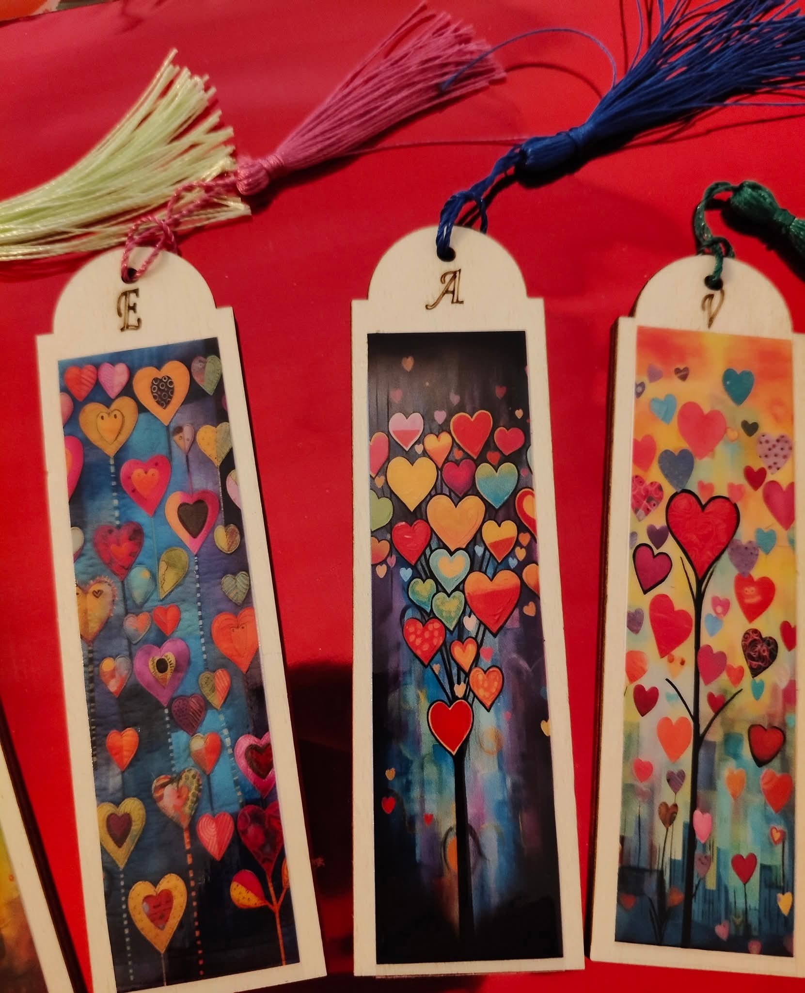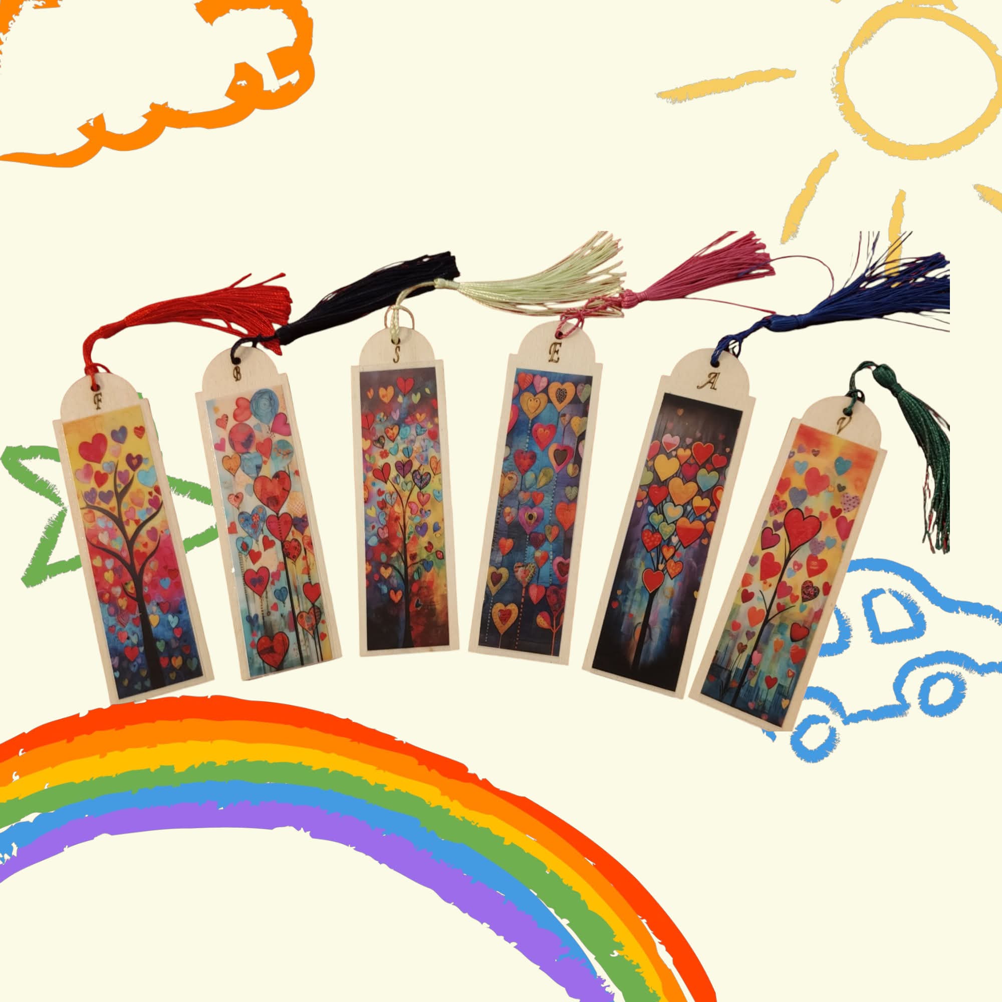 Bookmark made of wood and dtf printing with colored tassels (3.5 x 12cm, 3mm thick). Can be personalized with initials on request. Pack of 6.