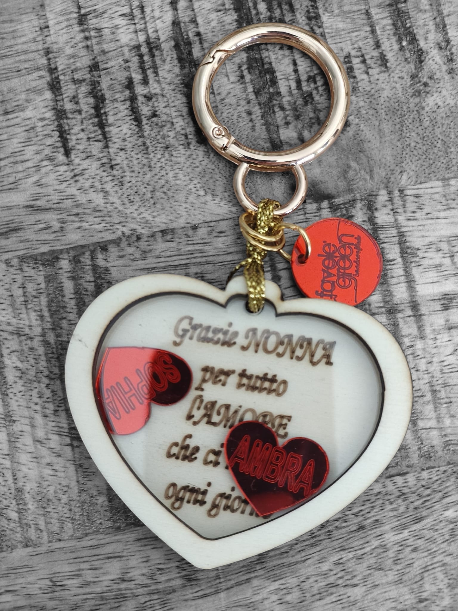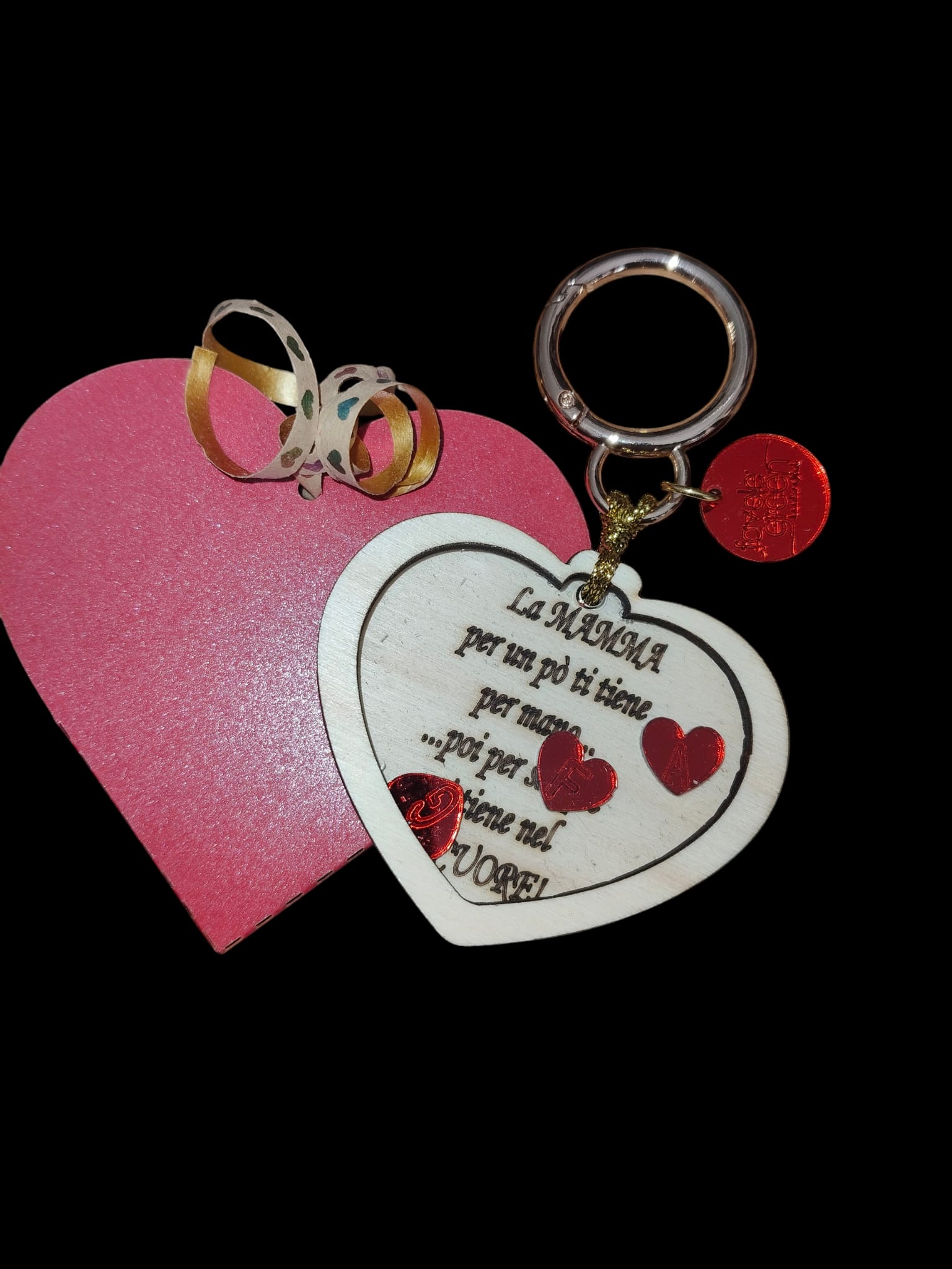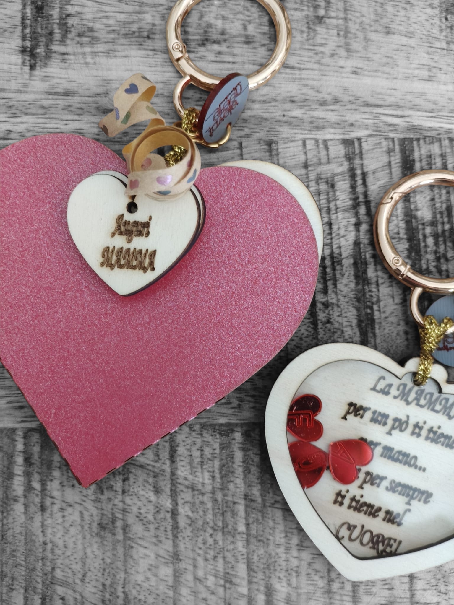 Wood and plexiglass keychain, with movable red hearts inside. Gift idea to celebrate Mother’s Day.