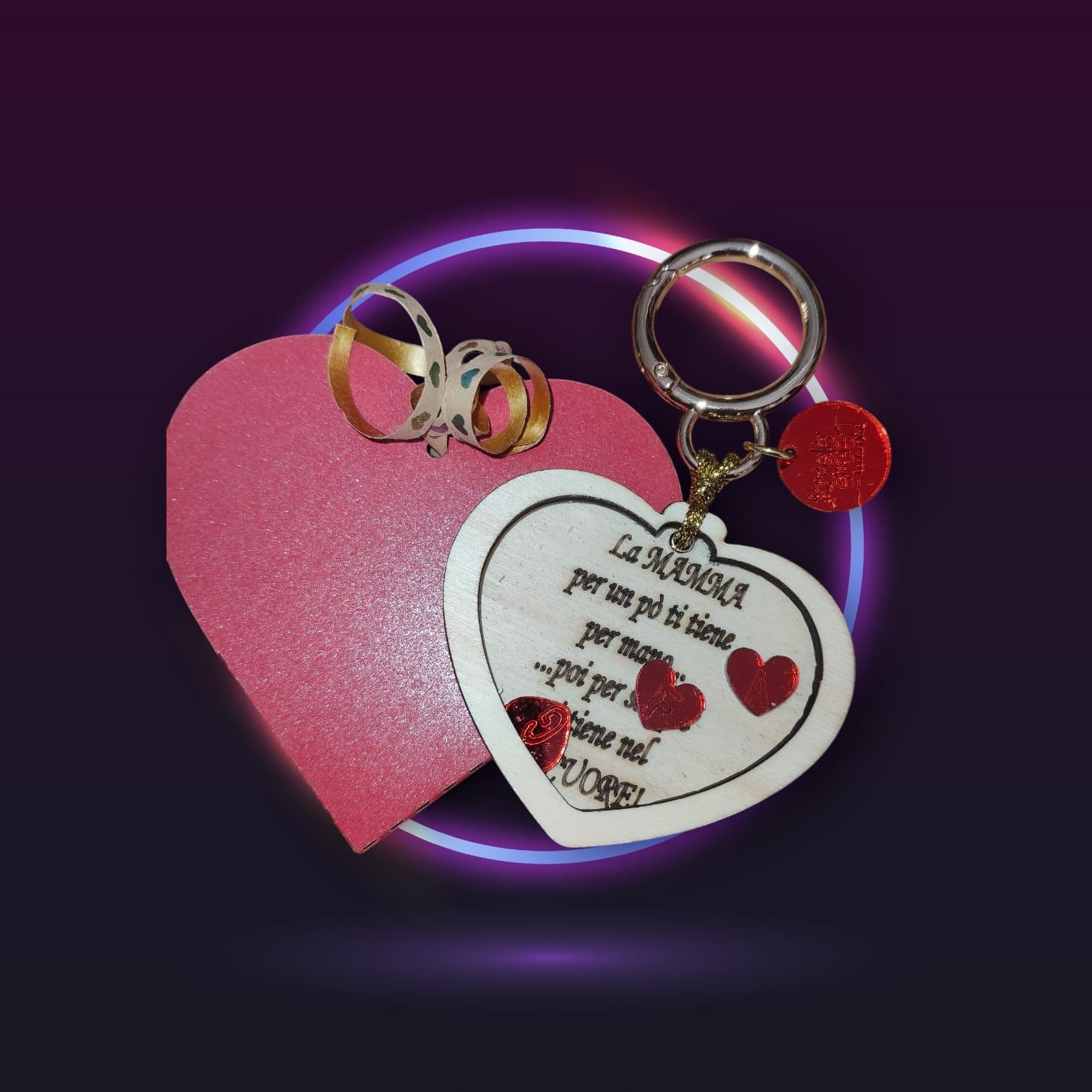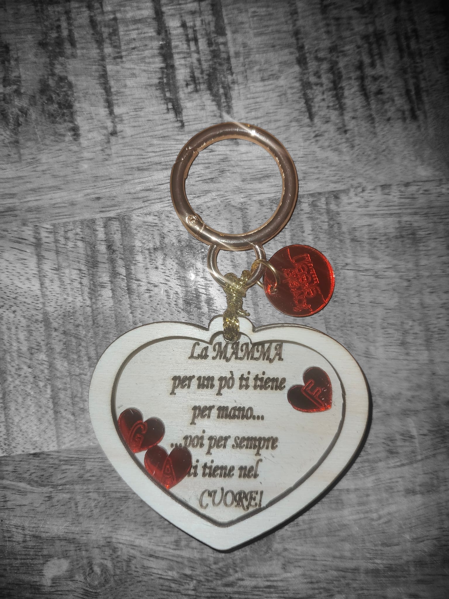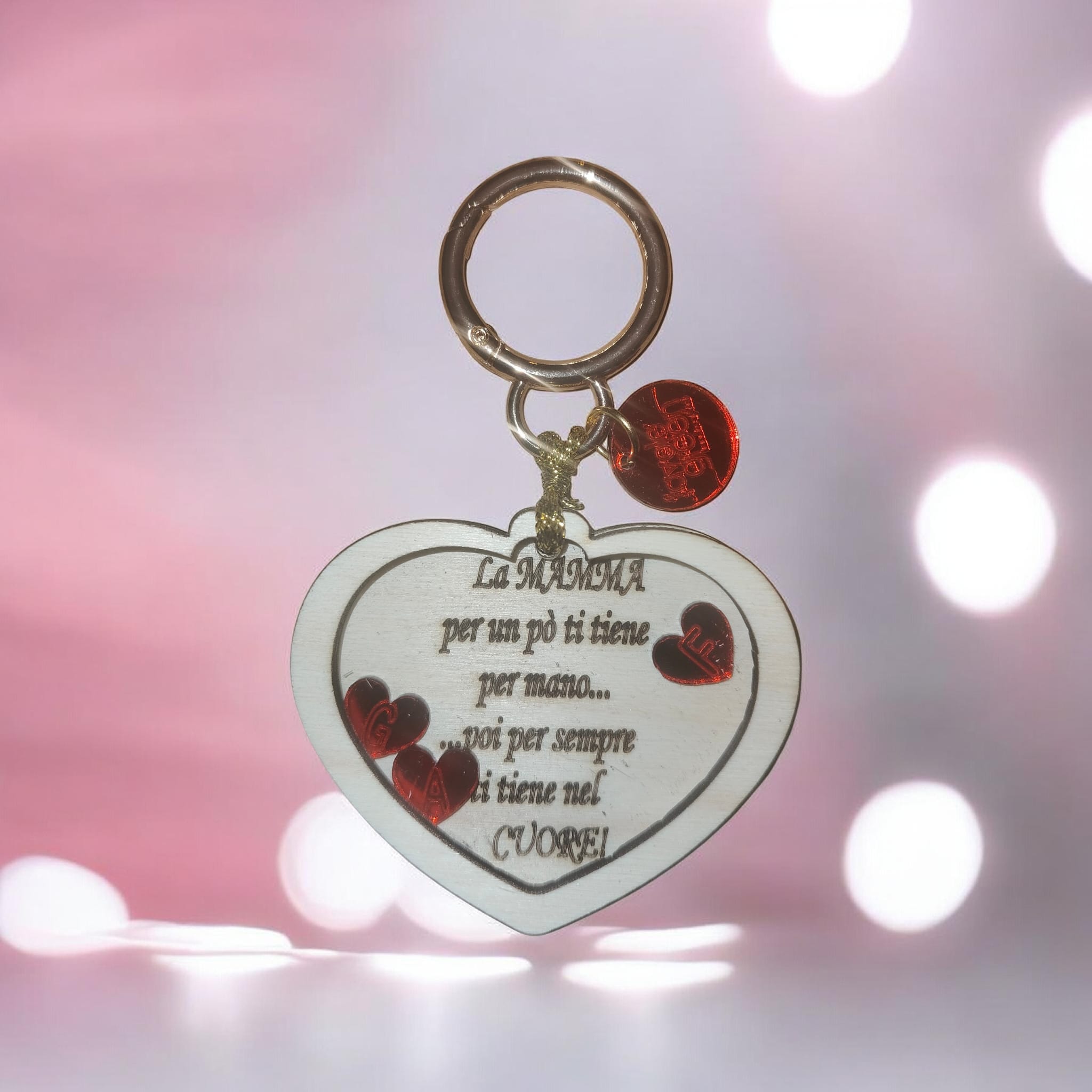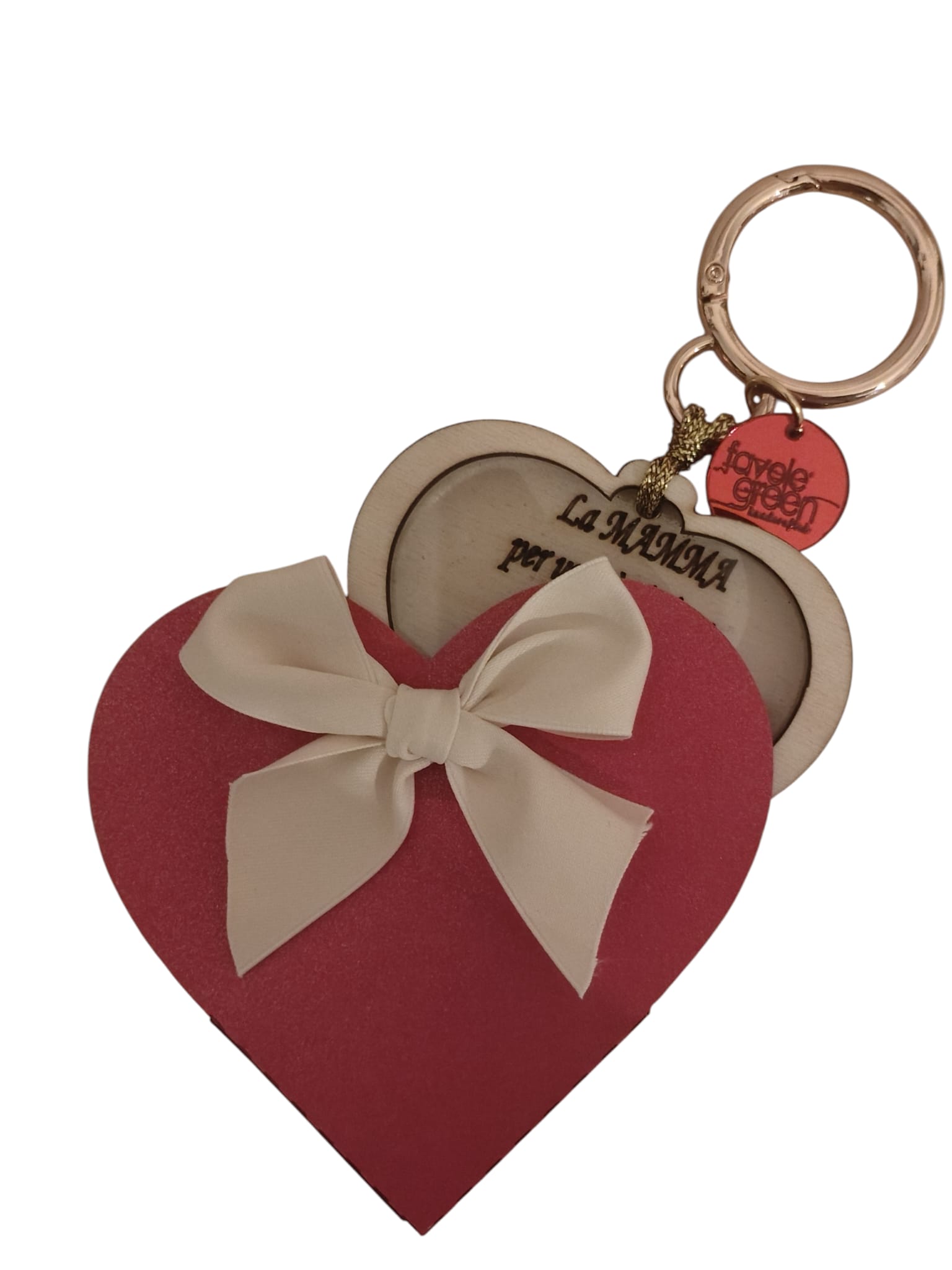 Wood and plexiglass keychain, with movable red hearts inside. Gift idea to celebrate Mother’s Day.