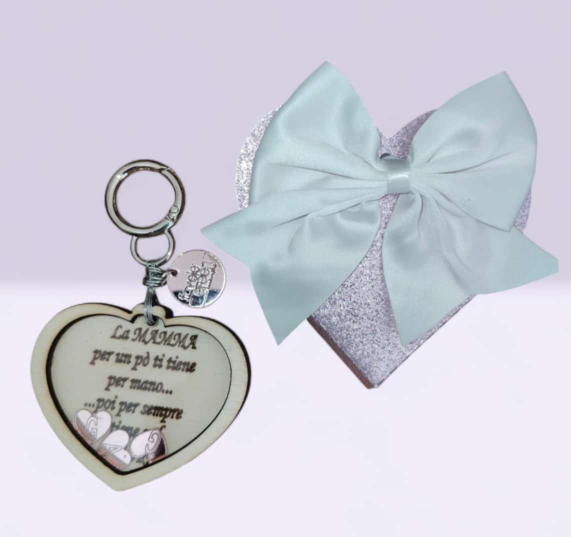 Portachiavi in legno, con cuoricini rossi mobili all’interno. Idea regalo per celebrare la festa della mamma.